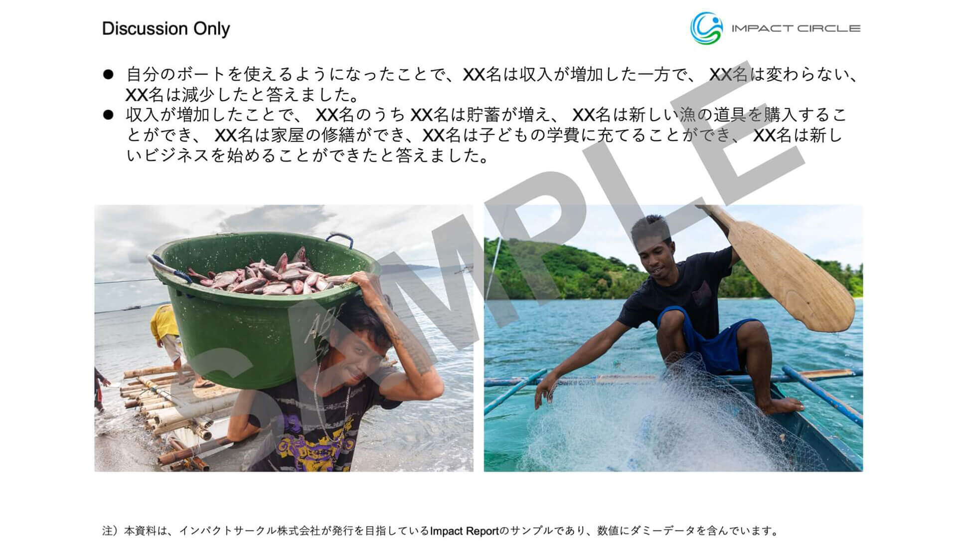インパクトサークルは、インパクトを個人のウェルビーイングに起きた定性的・定量的な変化としてのマイクロインパクト(例:収入増減による生活の変化、仕事や家族との関係性の満足度、など)と、その積算として環境・経済に及ぼす影響としての社会的インパクト(例:何人の貧困削減や教育機会に影響を与えたか、CO2の増減に繋がったか、など)と定義しています。