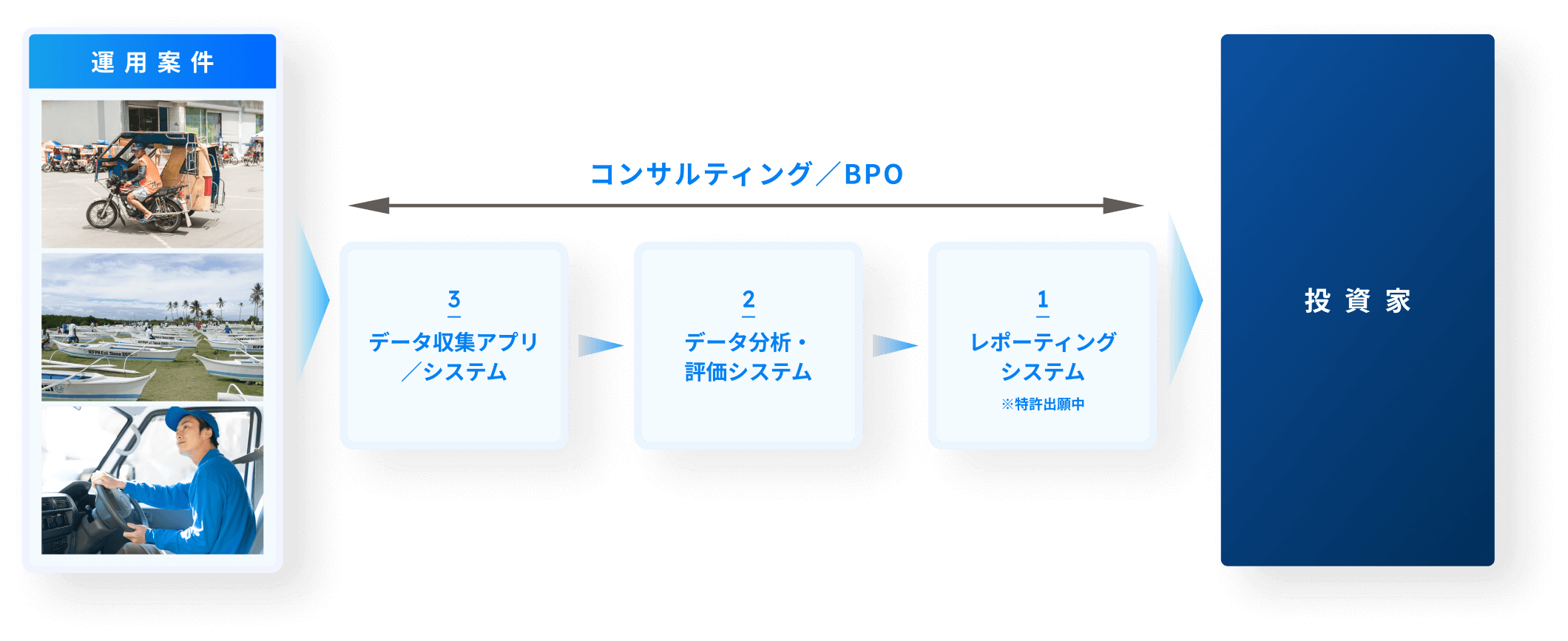 自社のインパクトファイナンスを通じて、インパクト可視化プロセスをノウハウ化し、コンサルティングやシステムを通じて、外部のインパクト事業者や金融機関に提供してまいります。
